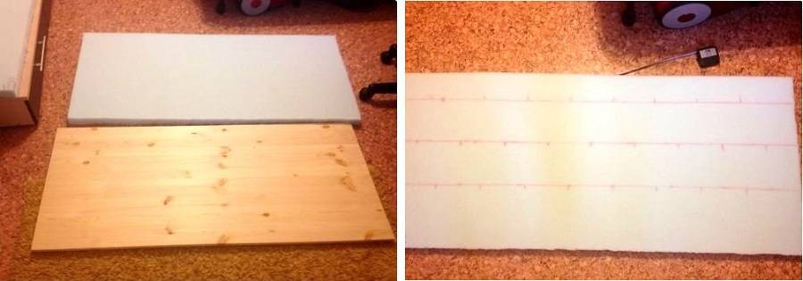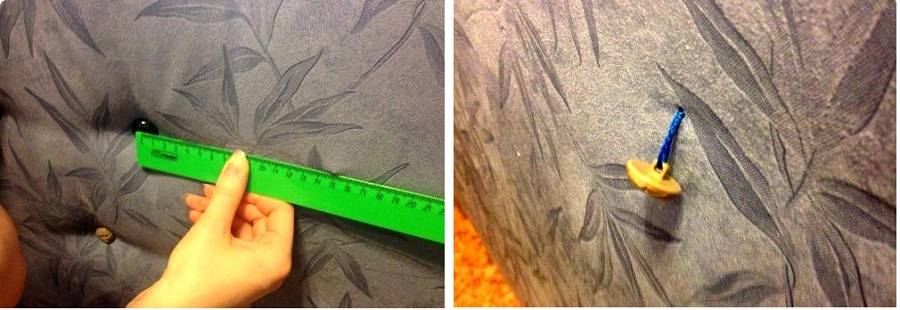 Возьмите лист фанеры, можно использовать прямоугольный либо вырезать интересную форму. В данном примере используется два щита размерами: 200 см на 60 см и 140 см на 60 см. Вырежьте поролон по размеру фанерной основы. Разметьте на поролоне места крепления пуговиц, например, в три ряда в шахматном порядке.