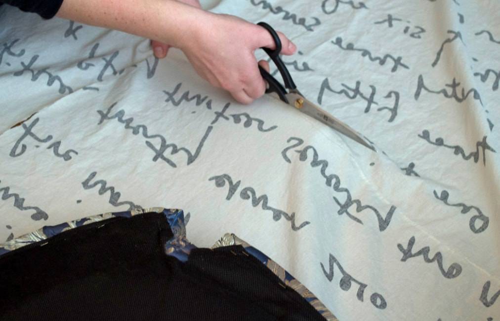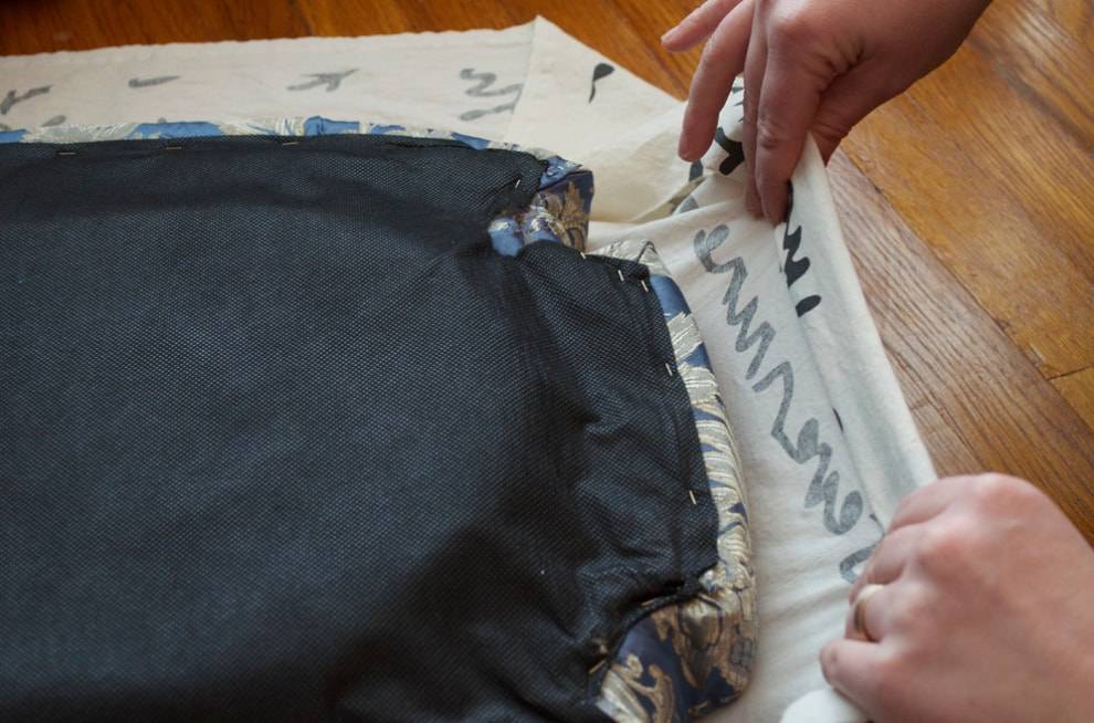 Сначала — изголовье, «подкладочный» слой. Возьмите кусок ткани, достаточный, чтобы обернуть деталь с большим запасом (в 20−30 см минимум, лишнее потом можно обрезать). Изголовье оберните тканью изнанкой наружу. На углах закрепляйте складки булавками. Затем снимите ткань, застрочите уголки и обрежьте лишнее.