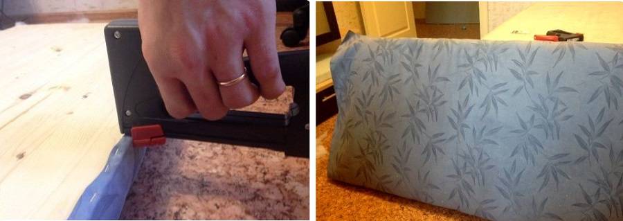 Выверните деталь для перетяжки изголовья на лицевую сторону, наденьте на изголовье. Края ткани заворачивайте, довольно плотно натягивайте и закрепляйте степлером. Можно начинать с середины каждой стороны, постепенно перемещаясь к краям. В идеале работать вдвоём: один — натягивает и держит ткань, второй — закрепляет ткань степлером.