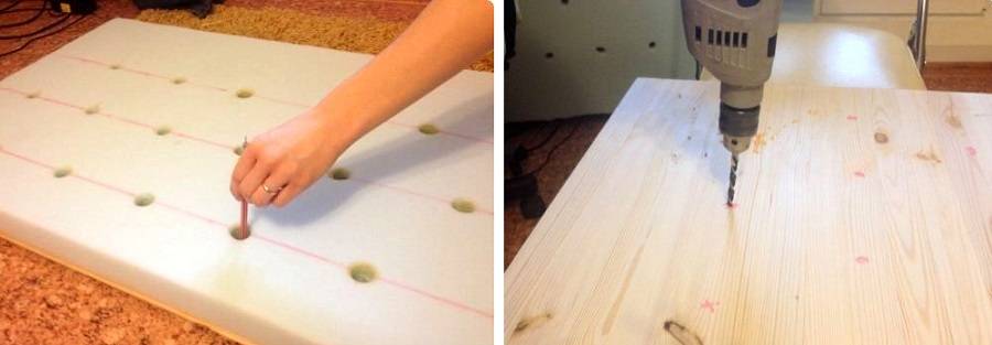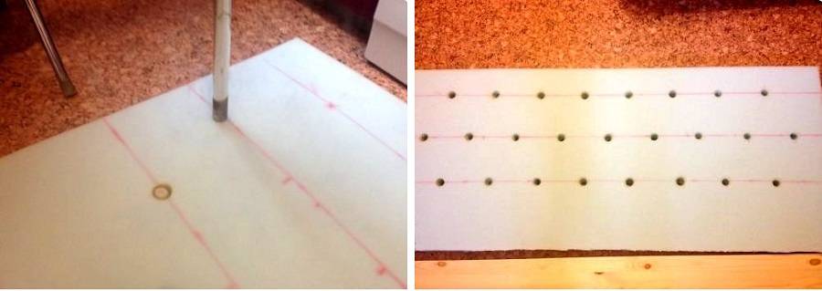 - теперь можно положить материал на фанеру и при помощи карандаша обозначить места под отверстия и сделать их дрелью. Используйте сверло для дерева диаметром 8 мм;