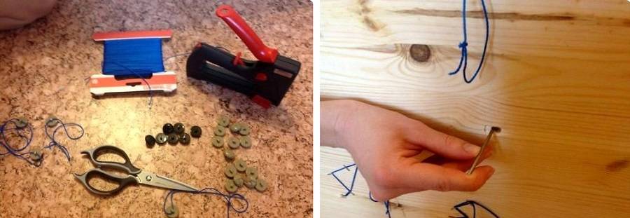 - на этом этапе можно заняться подготовкой пуговиц. Вы можете перетянуть их текстилем лично либо отдать мастерам. Проденьте шнурок в ушко каждой пуговицы. Используйте шнурки, длина которых не менее 15 см и завяжите их на узел. Вязальный крючок потребуется для того, чтобы просунуть шнурок через фанеру;