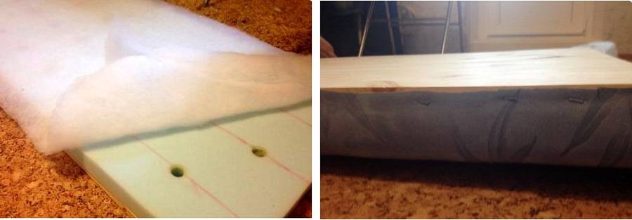 Кладем поролон на основу и маркером отмечаем места для проделывания отверстий. В этих местах делаем дырки диаметром не более 8 мм. Клеем поролон к фанере так, чтобы отверстия на этих двух материалах полностью совпадали. Сверху кладем синтепон с запасом, чтобы по краям было больше на 5 см. Размещаем основную ткань с запасом около 10 см по всему периметру. Переворачиваем фанеру со всеми материалами на ней, и при помощи мебельного степлера закрепляем ткань с изнанки.