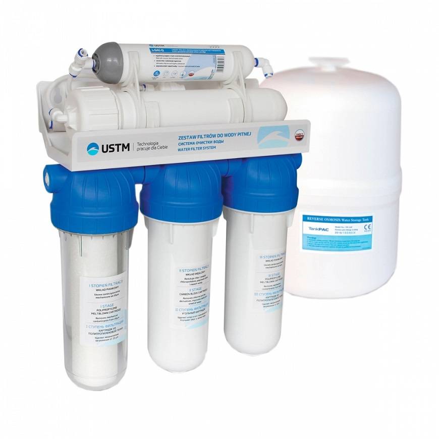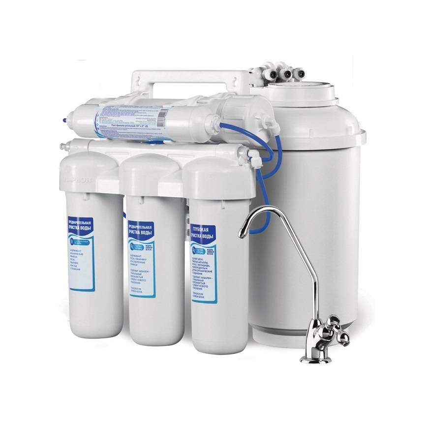 5-ступенчатый (в общей сложности)+ 1 дополнительный фильтр минерализации. Есть накопительный бак ёмкостью 8 литров. Фильтрует: нитраты и нитриты, хлор, растворённую известь, органику, вирусы и бактерии.