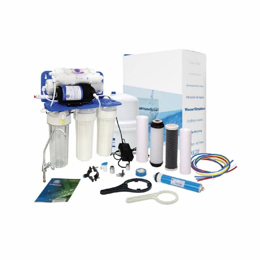 6-ступенчатая система с накопителем. Снабжена нагнетательной помпой. Выхъодной фильтр для регулирует жёсткость воды и её структуру. С ресурсом мембран, рассчитанных на 6 000 литров. В комплект входят фитинг-коннектор для крана и фум-лента.