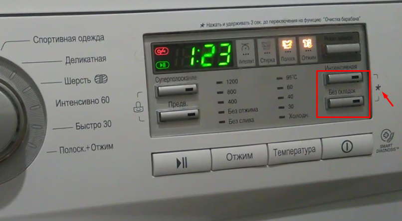 Как включить функцию очистки в стиралке LG? Для ее активации следует одновременно нажать и на протяжении 3 секунд удерживать две кнопки, которые на панели управления помечены звездочкой.