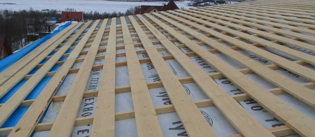 Мембрана укладывается снизу-вверх, крепится скобами из степлера. То полотно, которое раскатывается выше, заходит на уже уложенное на 15-20 см. Стык проклеивается двусторонний лентой (покупали вместе с мембраной). Затем поверх мембраны набивается планки, на них — обрешетка под фальцевую кровлю.