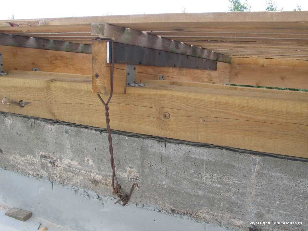 После того как выгнали стены, в них залили армопояс, в который через каждый метр установлены шпильки (Ø 10 мм). Когда бетон в армопоясе достиг требуемой порочности, на битумную мастику уложили слой гидроизоляции («Гидроизол», разрезанный вдоль на полосы нужной ширины). Поверх гидроизоляции укладывается мауэрлат — брус 150-150 мм. Все пиломатериалы, которые применяются для устройства кровли, сухие, обработаны защитными пропитками, антипиренами.