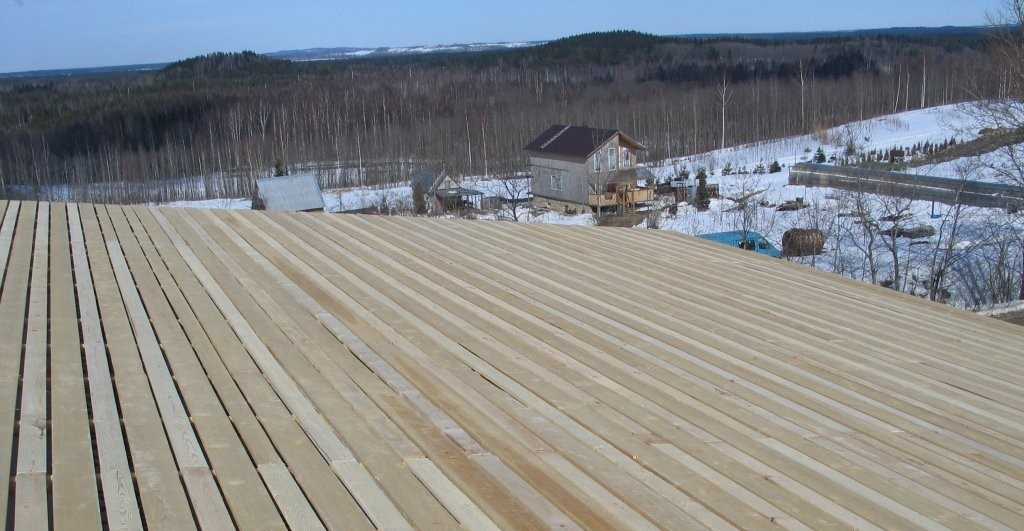 Сначала сделана обрешетка из доски 25*150 мм с шагом в 150 мм. После укладки, походив по крыше, решено усилить обрешетку. Для этого между уже уложенными досками набиваем доски 100 мм ширины. Теперь между досками остается зазор в 25 мм.