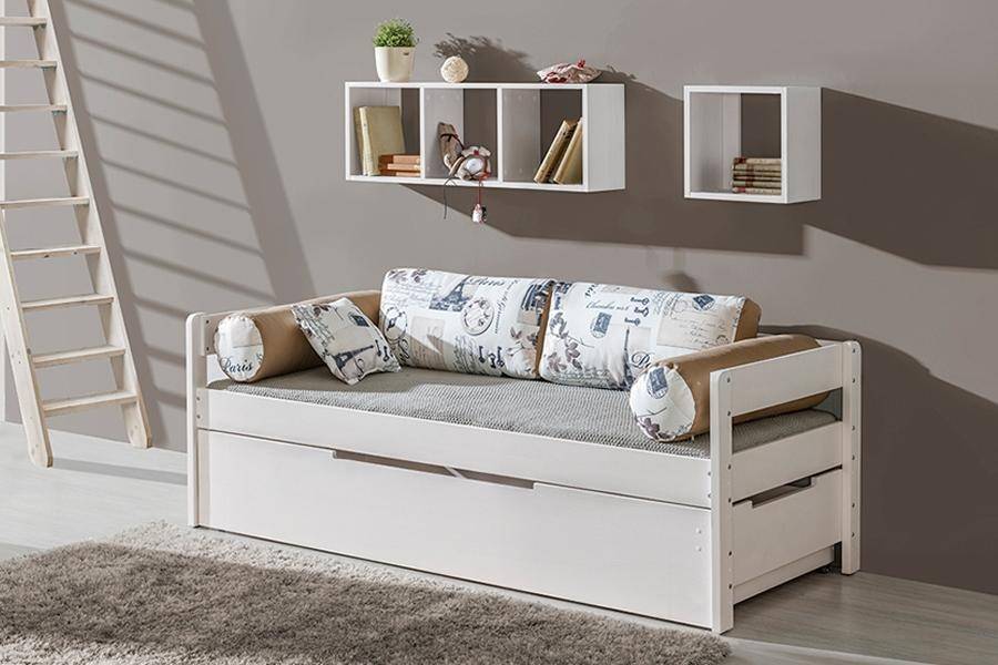 - Выкатной. Самый простой вариант. Для раскладывания необходимо потянуть основание конструкции на себя, затем опустить спинку на опустевший элемент корпуса. Нижняя часть дополняется выдвижными ящиками для хранения спальных принадлежностей.