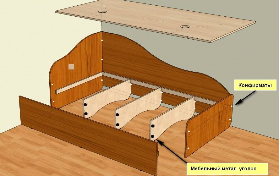 - Боковины разметить под крепления бортиков. На них ляжет подматрасный щит. Прикрутить их к боковинам.