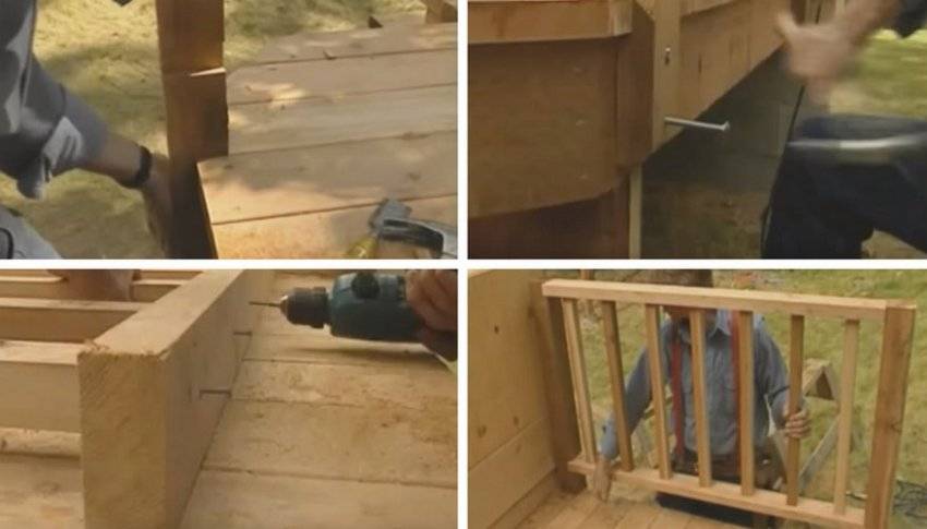 Чаще всего поручни крепят таким же способом, как и основные столбцы. В качестве перил используют нарезанные рейки или заранее заготовленные балясины. Также, можно изготавливать перила в виде рамки, которая после сборки устанавливается в проем между двумя опорами. Ее нижнюю часть крепят к основанию веранды, а к верхней рейке прикручивают поручень. На этом этапе деревянная конструкция проверяется на крепость и устойчивость. При помощи строительного уровня выявляют и устраняют все погрешности.