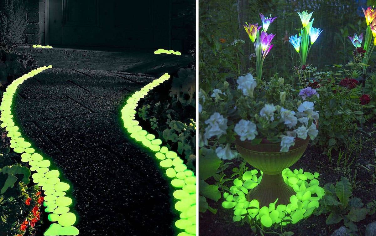 Светящиеся камни. Удивительный эффект получают при размещении в разных уголках камней, которые покрывают флуоресцентной краской. Светящимися акцентами оформляют дорожки, цветники, водоемы. Ночью они издают таинственное свечение, которое не только позволяет освещать окружающее пространство, но и привносит в ландшафт сказочную атмосферу.