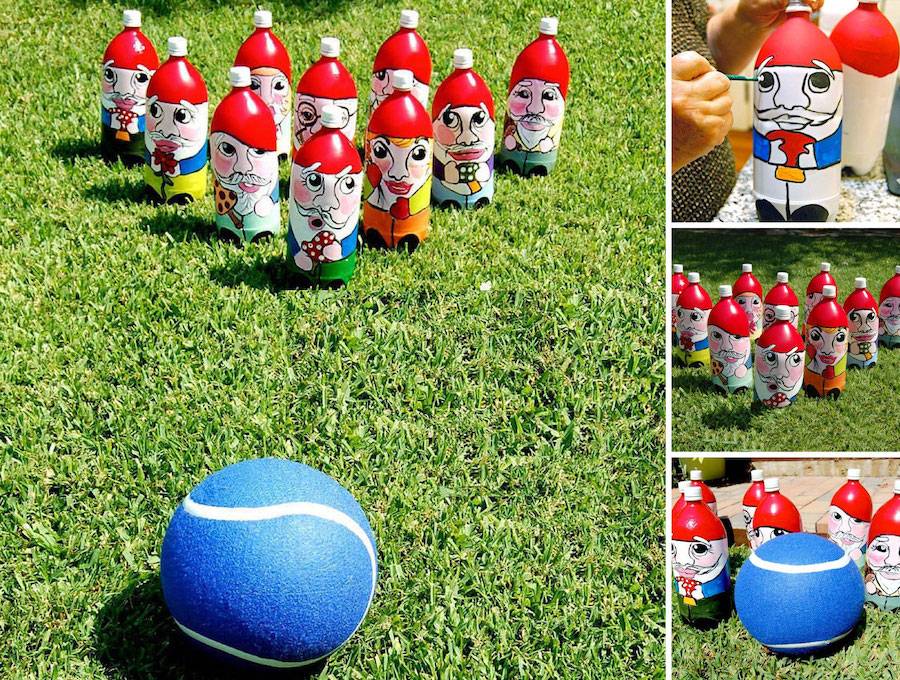 Ярких красочных гномиков собственными руками можно изготовить с целью украшения цветника или участка с декоративными кустарниками, используя пластиковую емкость объемом 5-6 литров. А также нужно подготовить литровые пластиковые бутылки, шило, краски, кисти, клей и декоративные детали для оформления.