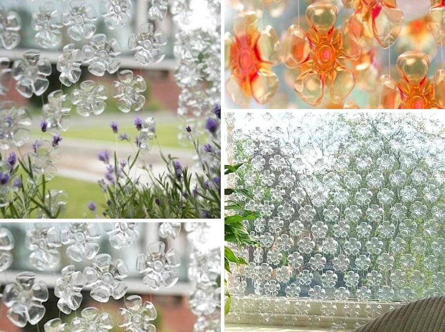 Из донышек или крышек пластиковых бутылок несложно собрать элегантную стильную штору, которая украсит окна или двери окна дачного домика, послужит изящным украшением входа на веранду или беседку.