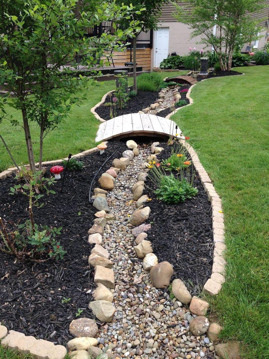 Сухой ручей. Оригинальным стильным решением служит обустройство извилистого «сухого» ручья. Его размеры и направление выбирают, ориентируясь на особенности участка. Часто дополняют ручей уютным фонтаном или изящным мостиком. В законченном виде получается необычный, очень выразительный объект, который становится центром всего ландшафта.