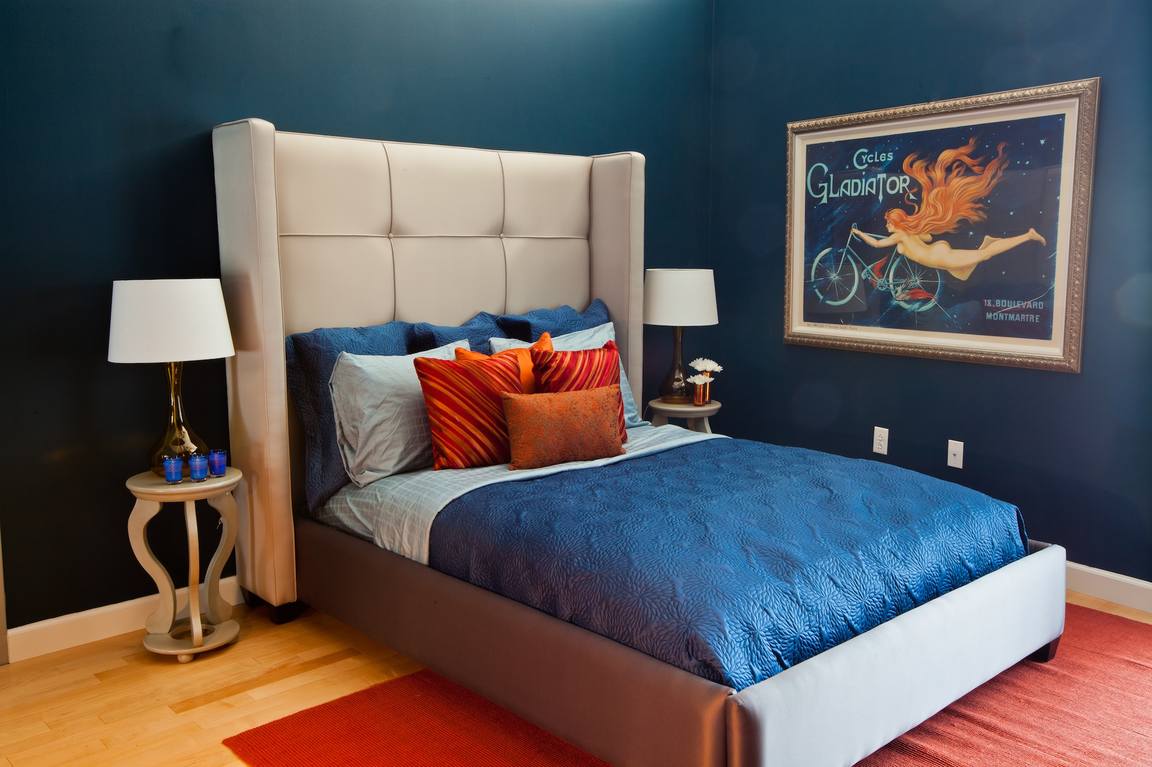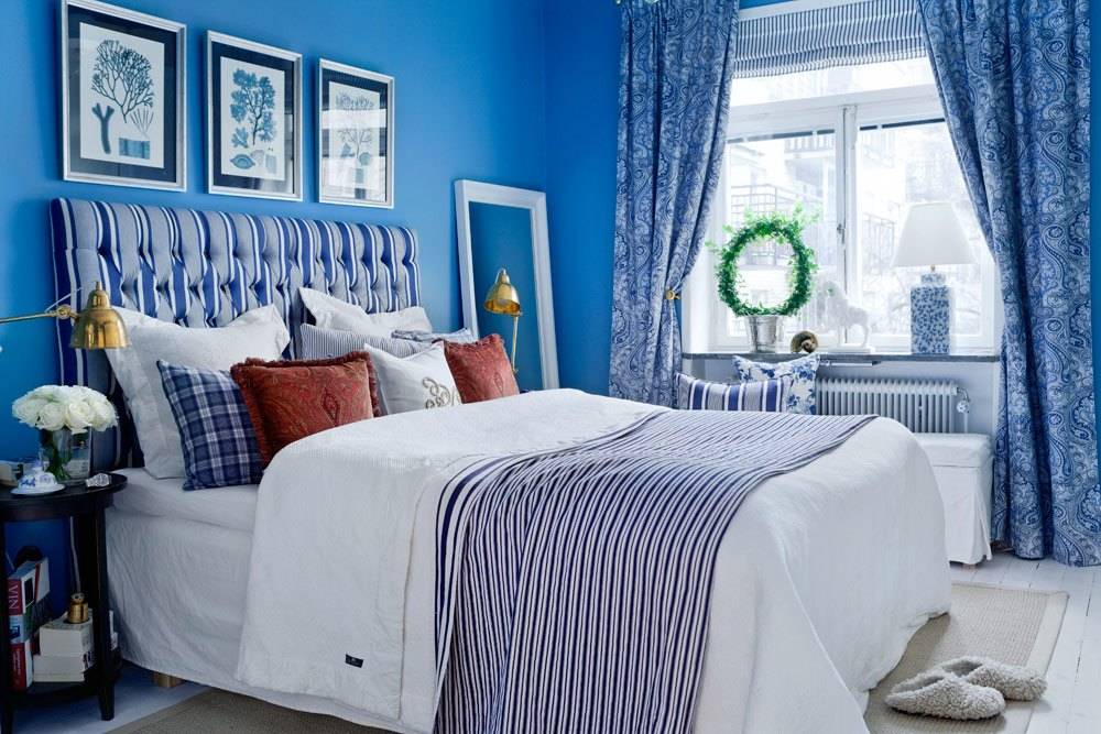 Праздничный васильковый цвет с легким оттенком фиолетового прекрасно подойдет для детской комнаты – как для мальчика, так и для девочки. Кроме того, ярко-синий прекрасно сочетается с природными мотивами: домашними растениями и деревянной мебелью. Спальню в тёпло-синей гамме оценят творческие люди. Если в комнате оборудовано рабочее место, обстановка оживит мышление и наполнит энергией, а ночью при выключенном свете настроит на сон.