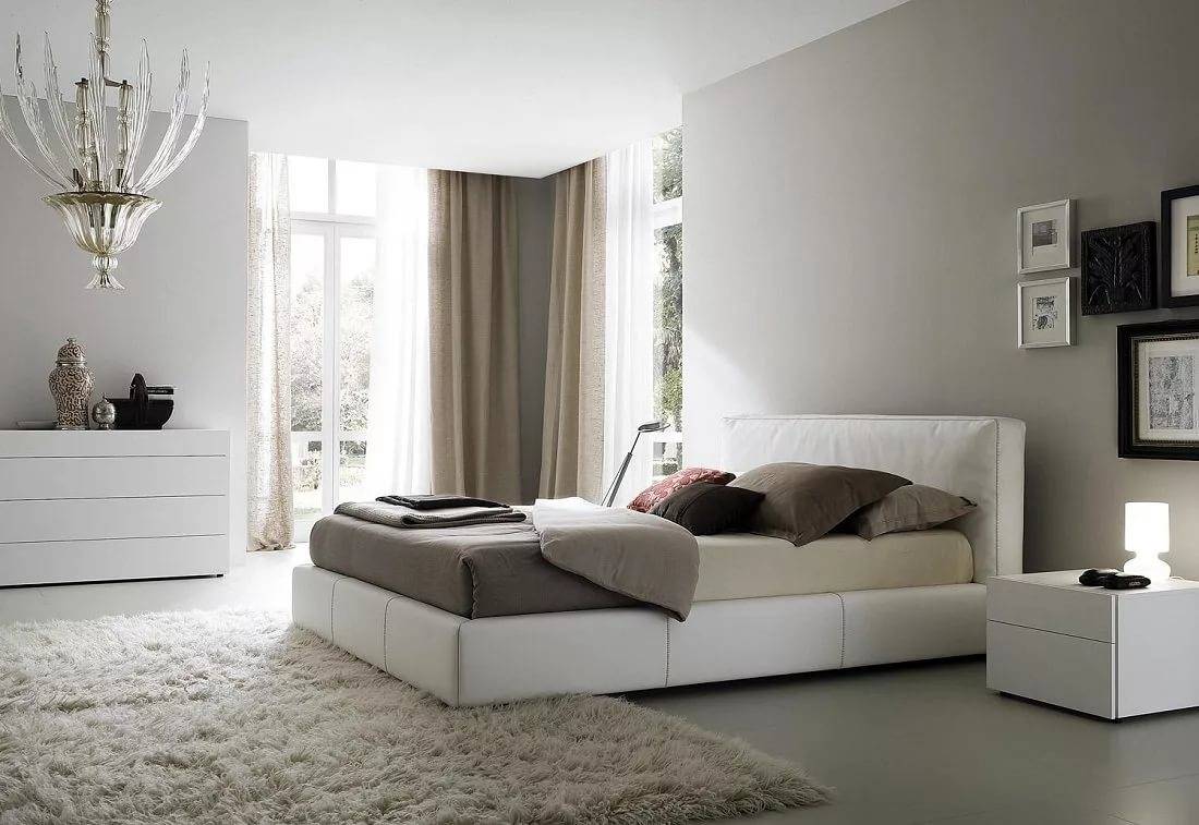 В большой комнате дизайнеры разрешают использование темного заднего плана и светлой мебели. Бежевая кровать смотрится очень большой и парящей над полом. Сочетание коричневых и песочных стен позволяет визуально корректировать неправильность вытянутой (прямоугольной) спальни.
