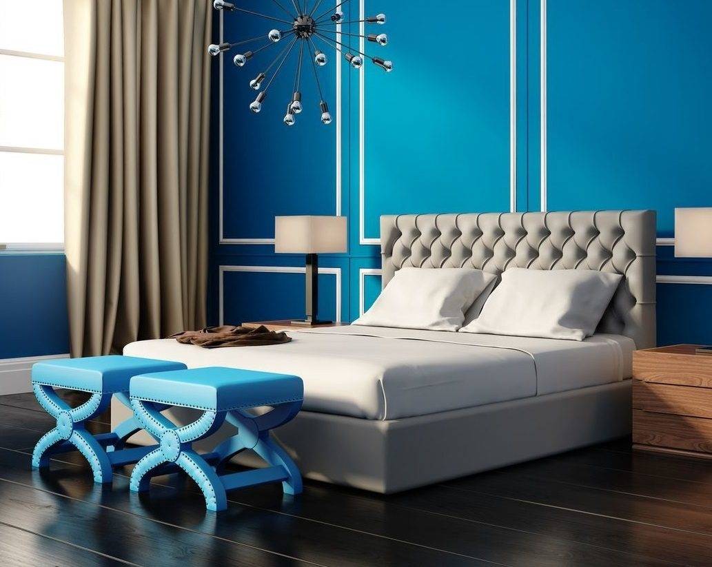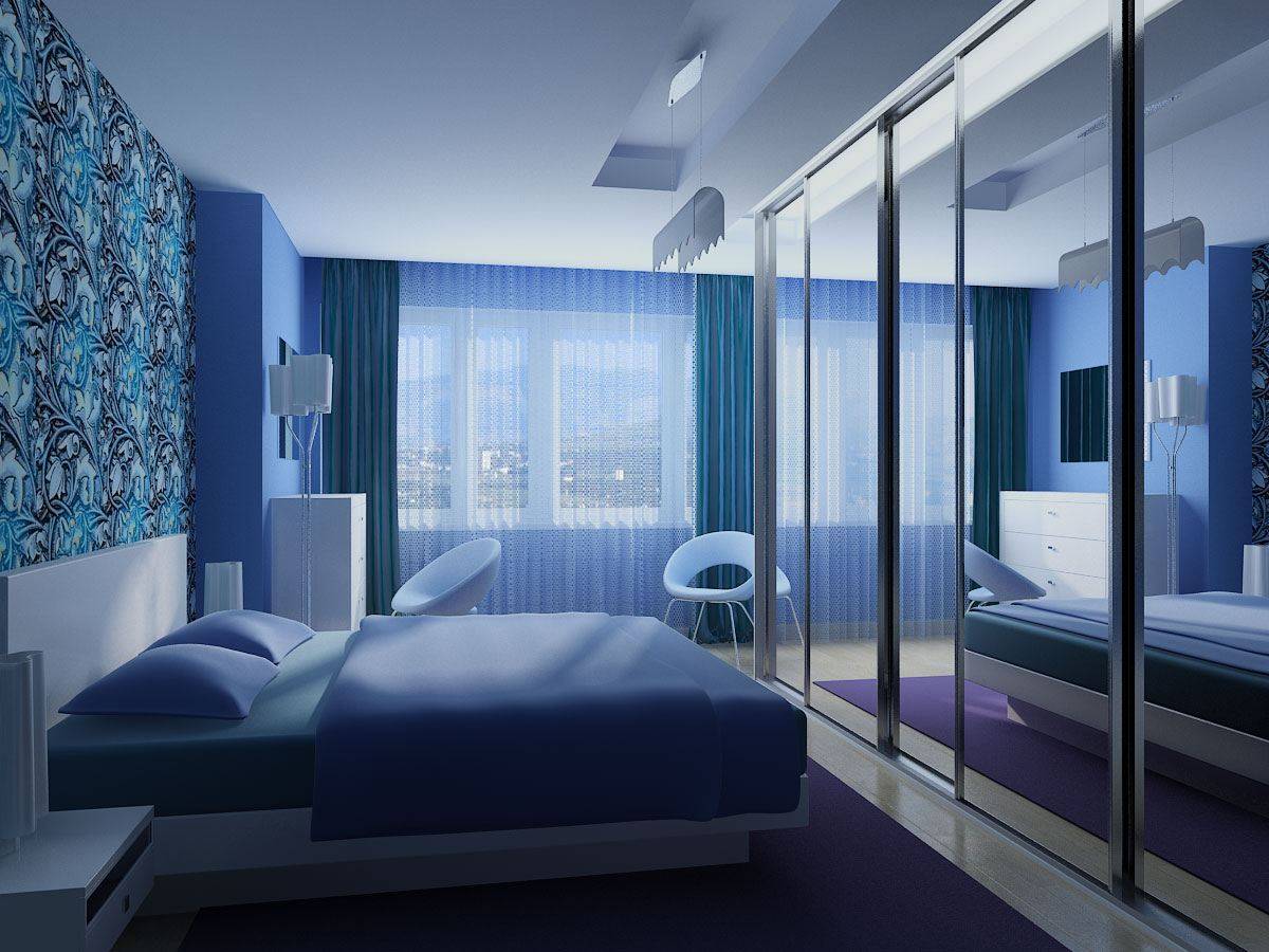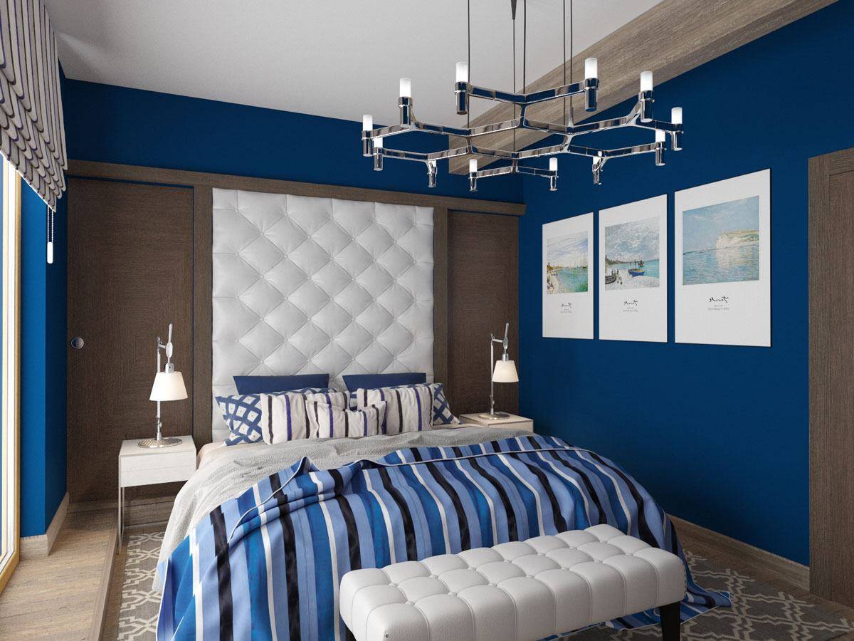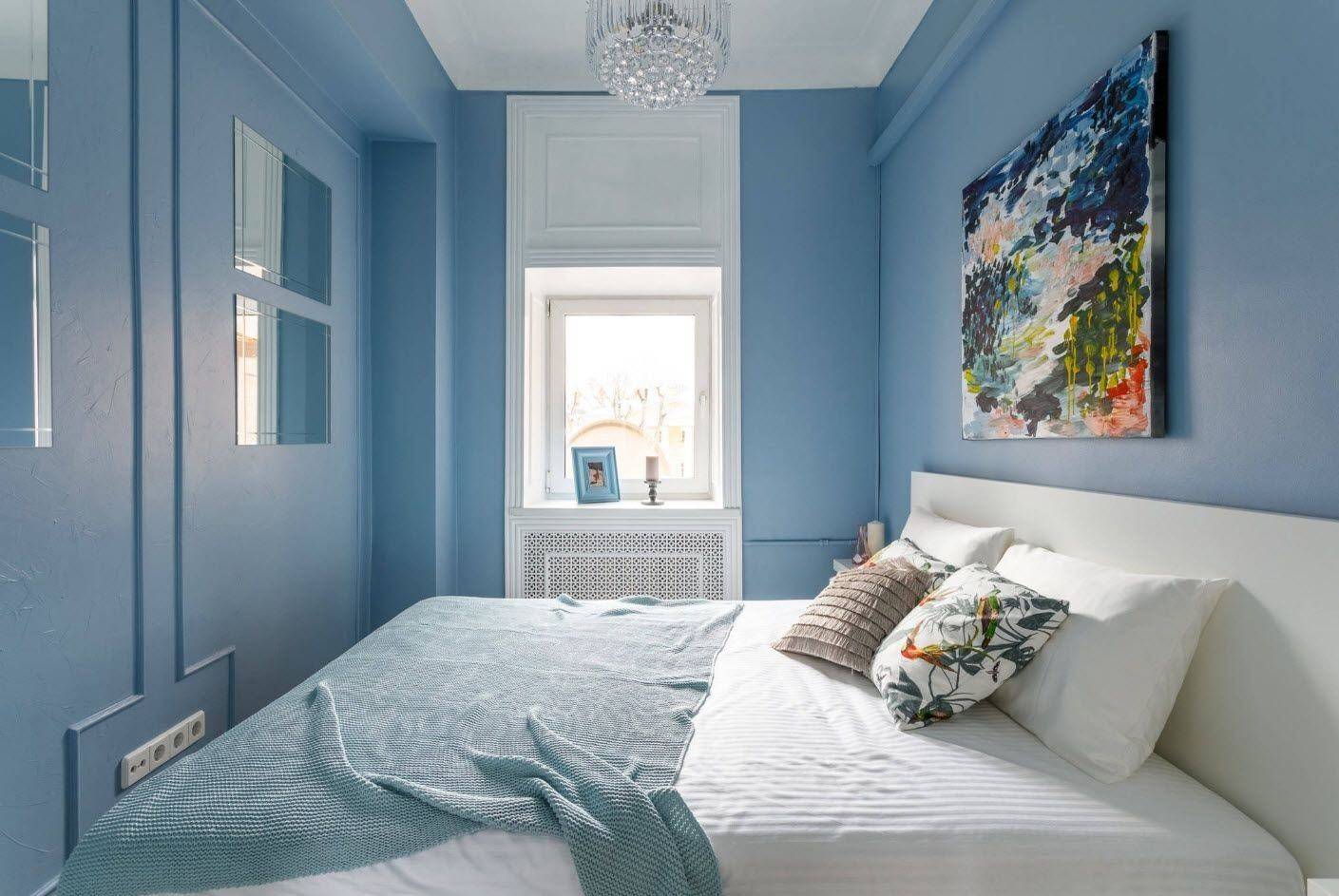 При проектировании маленькой спальни, безусловно, разумнее всего будет обратиться к ярким оттенкам, например, к голубому, который оптически расширяет интерьер. Если у спальни большая площадь, можно выбрать более темный цвет, например, темно-синий.