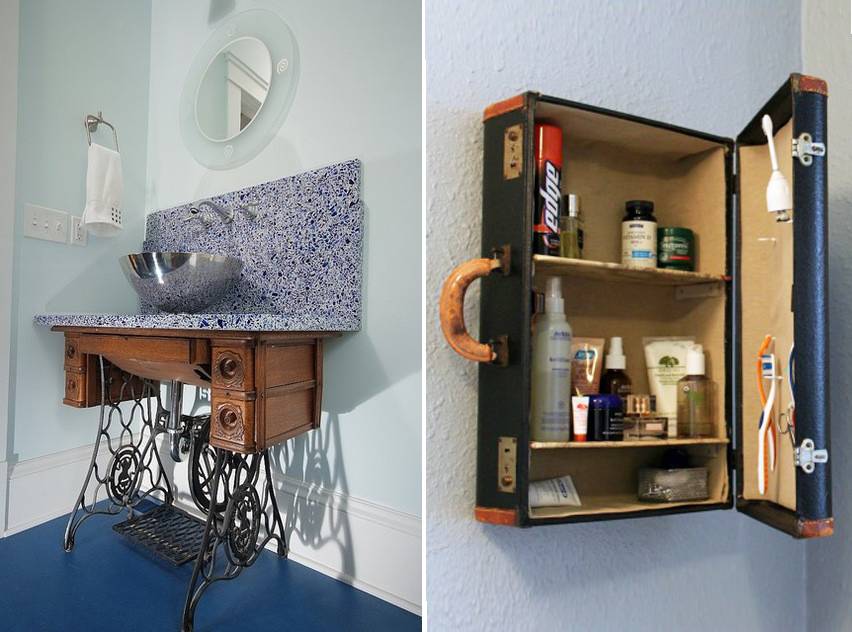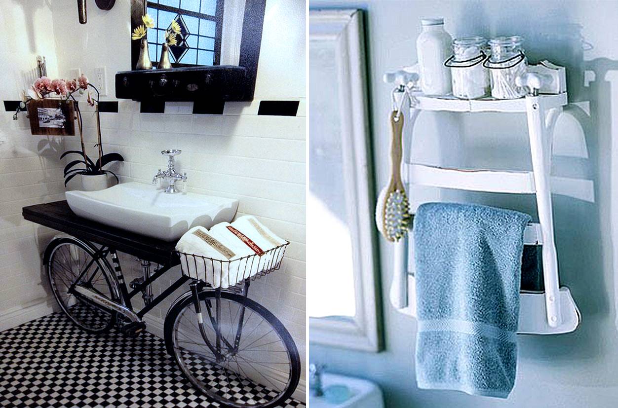 Подставкой под раковину могут служить такие необычные вещи, как швейная машинка зингер или велосипед (это в случае, если вам не нужно дополнительное место для хранения). Аптечкой может служить переоборудованный старый чемодан (а если приделать к нему зеркало, то можно сделать вещь многофункциональной), держателем для полотенец может стать часть стула (смотрите на картинку!). Когда бюджет трещит по швам, просыпается креатив и порой рождаются очень интересные решения.