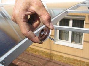 Крепление листов поликарбоната осуществляется саморезами с термошайбой. Листы крепятся встык друг к другу, после чего стыки промазываются силиконовым герметиком.