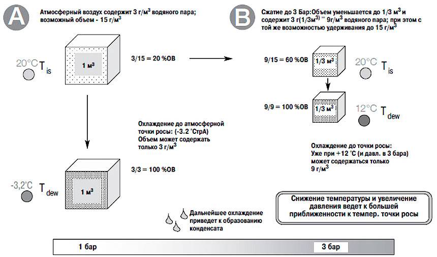 Всегда стоит учитывать, что водяные пары начинают конденсироваться не только при снижении температуры воздуха, но и при одновременном уменьшении объема воздуха. Этим самым снижается возможность воздуха поглощать влагу.