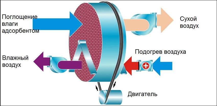 Современный пример данного вида – адсорбционный осушитель с силикагелевым ротором. При вращении адсорбент перемешивается. Через большую часть диска воздух поступает в прибор, вода конденсируется, а высушенный и нагретый воздух выходит через меньшую часть (подсушивая силикагель) в помещение.