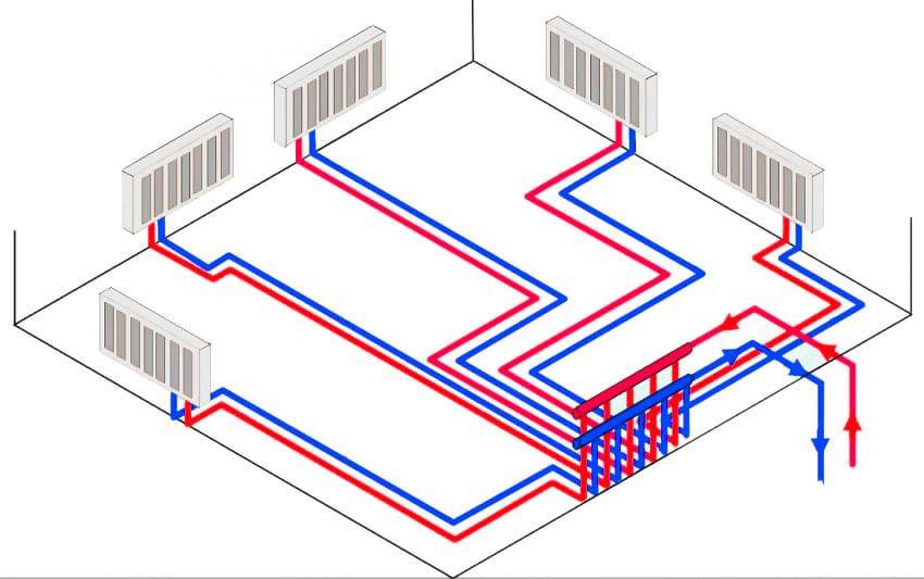 Схема раздельно питает каждый радиатор и позволяет монтировать систему «тёплый пол». Важный недостаток – большие затраты на приобретение труб.