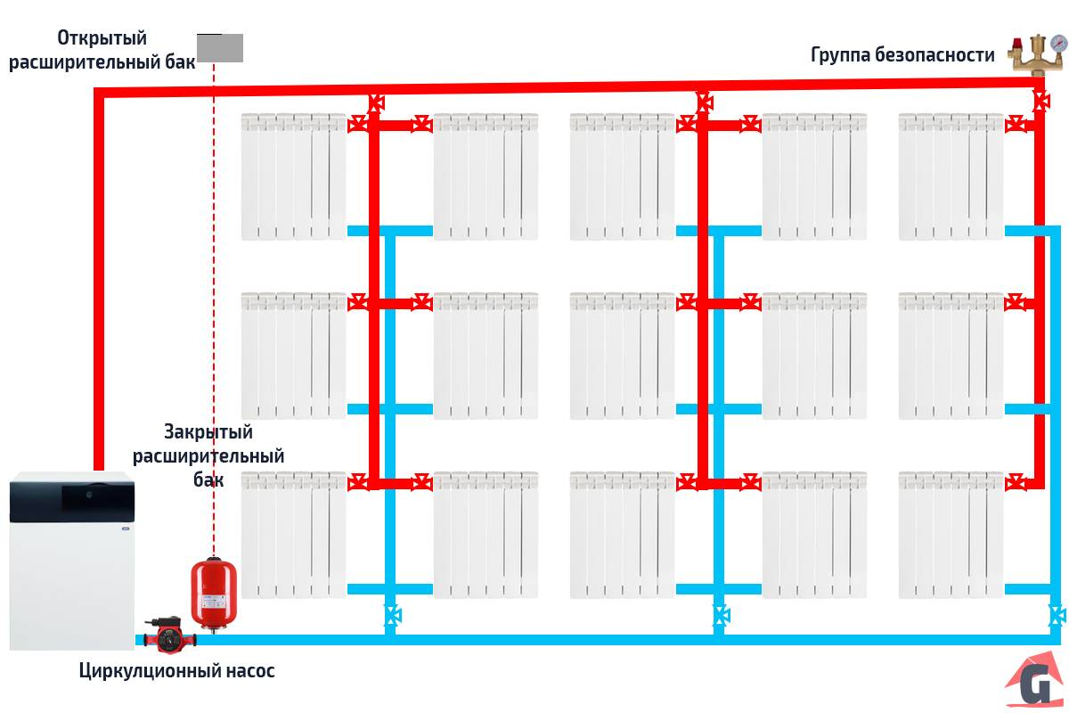 Преимущественно такие схемы используют в системах с принудительной циркуляцией.