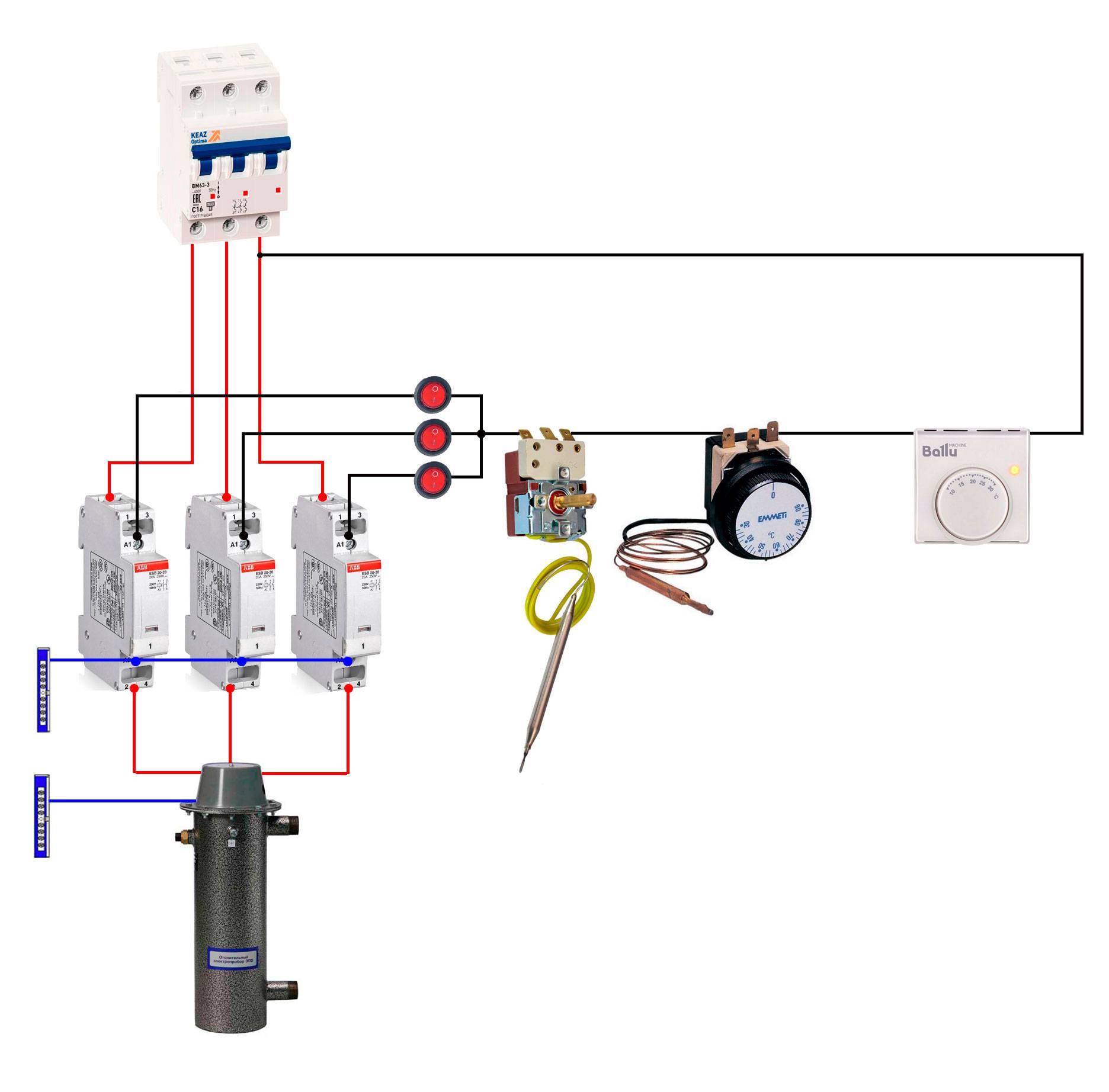 Большинство заводских электрокотлов отопления построено именно на таких принципиальных схемах управления. Есть одна питающая линия (фаза), подающая сигнал на катушку прибора с силовыми элементами, а все дополнительное оборудование, датчики и релюшки, как раз-таки и “навешиваются” на эту самую линию, выполняя защитную и контролирующую функции.