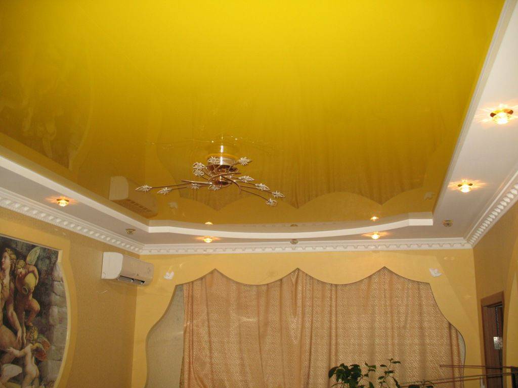 желтый – это некий дизайнерский эксперимент, который при должном подходе не будет обречен на провал; чаще всего желтую палитру натяжных потолков используют для оформления пространства детской комнаты и гостиных, оформленных в контрастных цветах;