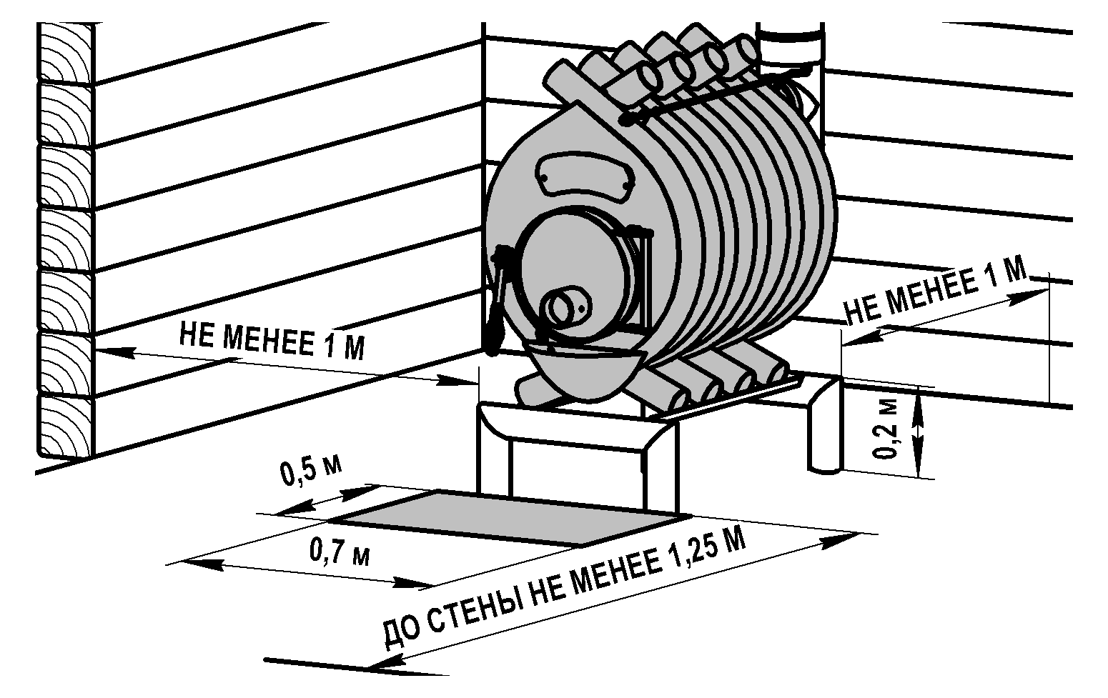 - при монтаже печи требуется много свободного пространства: расстояние от стены до печи должно составлять не меньше метра;
