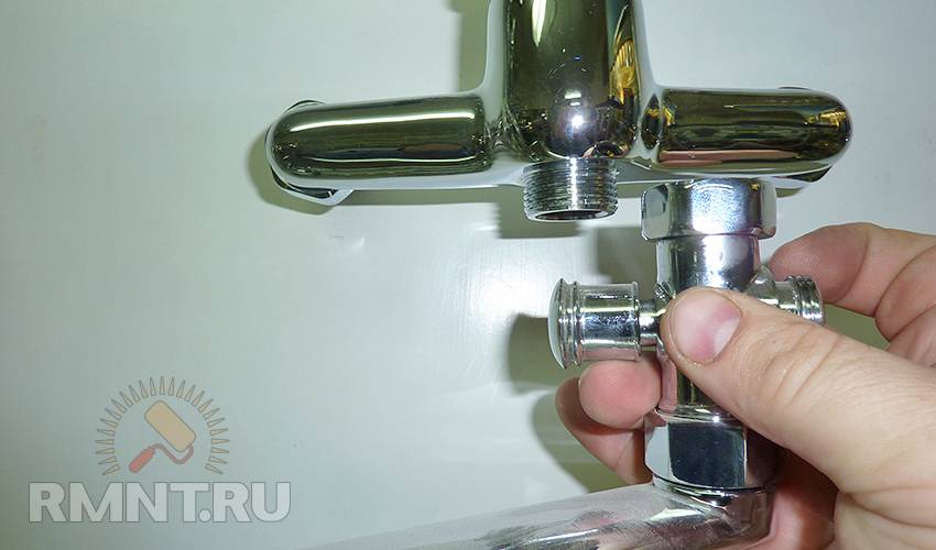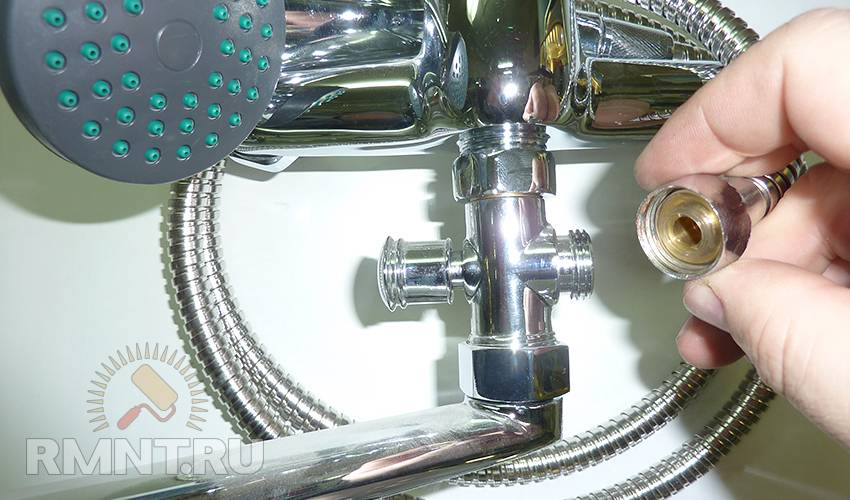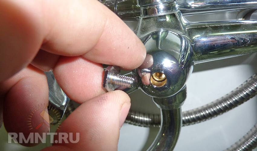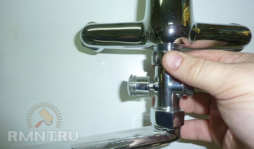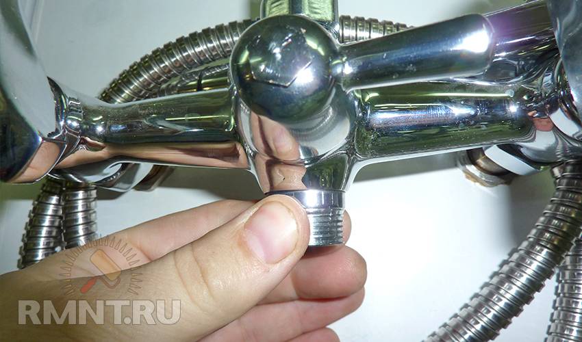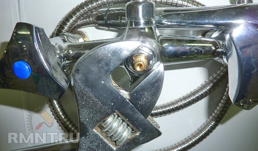 Переключатель аккуратно выкручивается из смесителя при помощи разводного ключа. Когда механизм свободно вращается внутри корпуса смесителя, его нужно аккуратно вывернуть из него, не повредив пружину и прокладки;