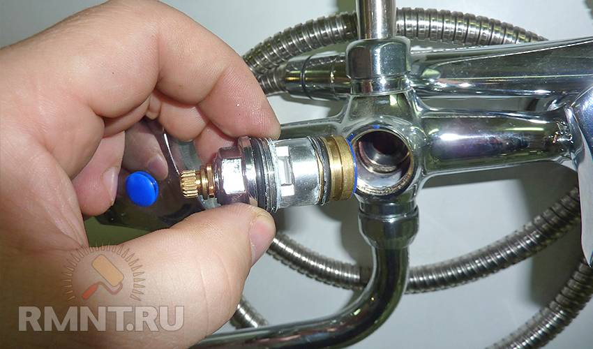 - выполняется выкручивание гайки, которая обеспечивает фиксирование картриджа в смесителе;