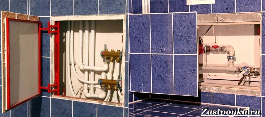 Иногда делают технические ниши больших размеров, например, если необходимо замаскировать за фальшстеной бойлер, распределитель, фильтр, счетчик, коллектор холодной и горячей воды или другое оборудование. Нередко большая ревизионная ниша требуется в туалете или совмещенном санузле для обслуживания канализации. Если найти люк подходящих размеров не удается, то можно прибегнуть к другим способам маскировки коммуникаций.