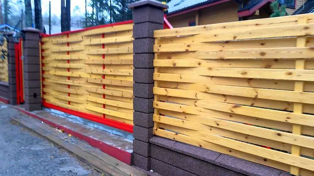 Столбы для такого забора делают из бруса не менее 80*80 мм, но более долговечны из профилированной трубы. Размер 60*80 мм или 40*80 мм, можно брать квадратные. Зависит от того, как будете крепить доску. Пролет между опорами — 2,5-3 метра, а между ними ставят промежуточную — из бруса 40*40 мм или около того. Точно пролет определяется по месту и часто зависит от гибкости доски.
