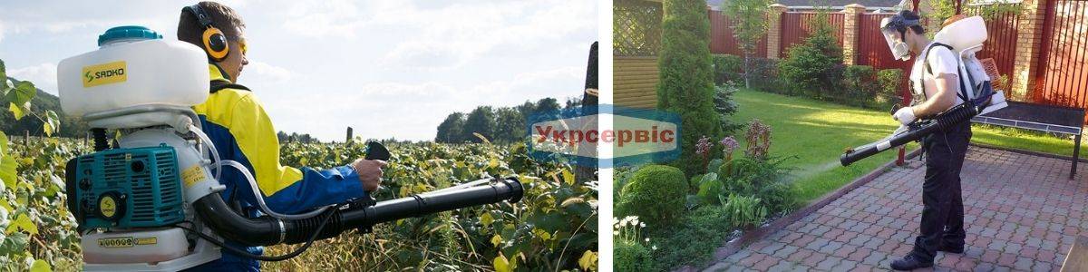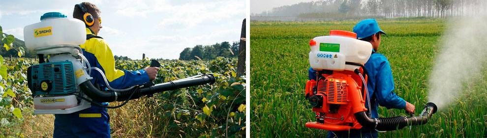 - Ранцевые. Их носят за спиной, по типу походного рюкзака. Вес агрегата равномерно распределяется по телу человека, освобождая руки. К такому виду можно отнести помповые, бензиновые и прочие аппараты.
