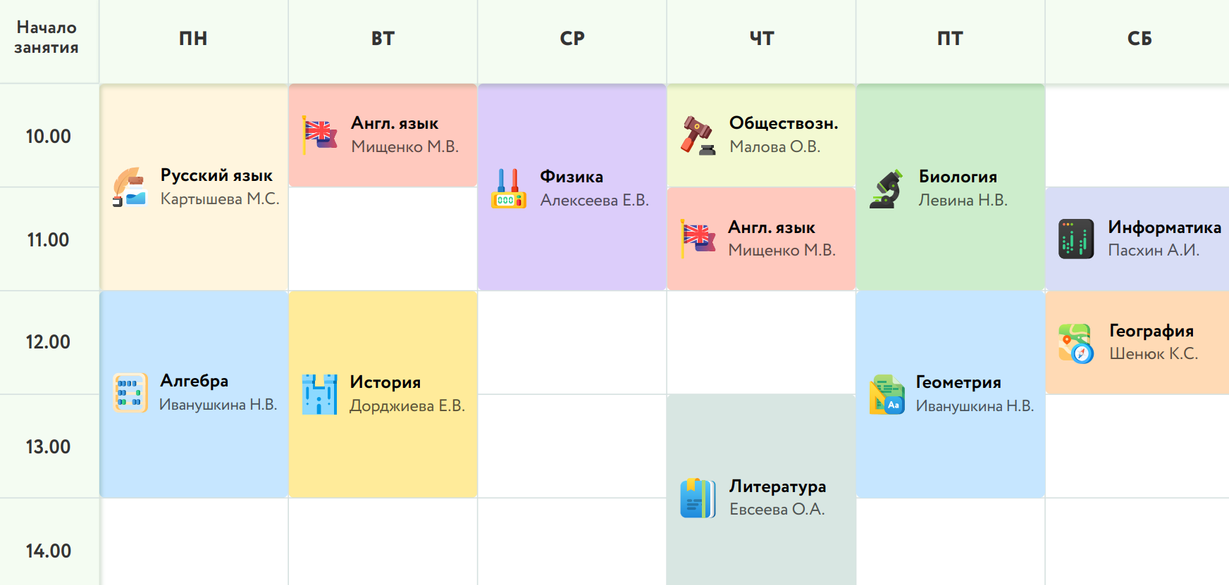 В зависимости от класса, в расписании «Домашней школы Фоксфорда» от одного до четырёх базовых уроков.