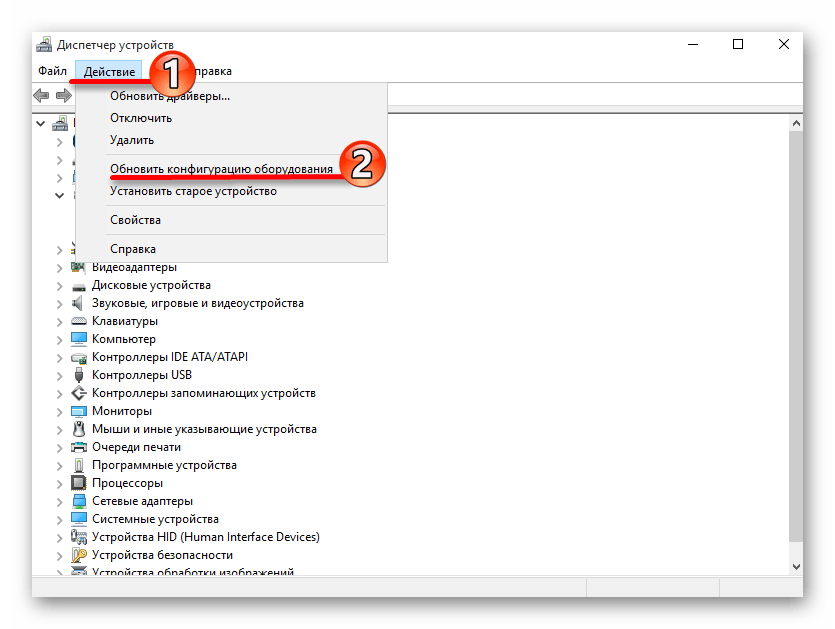 Теперь откройте меню вкладки «Действие», выберите «Обновить конфигурацию оборудования».