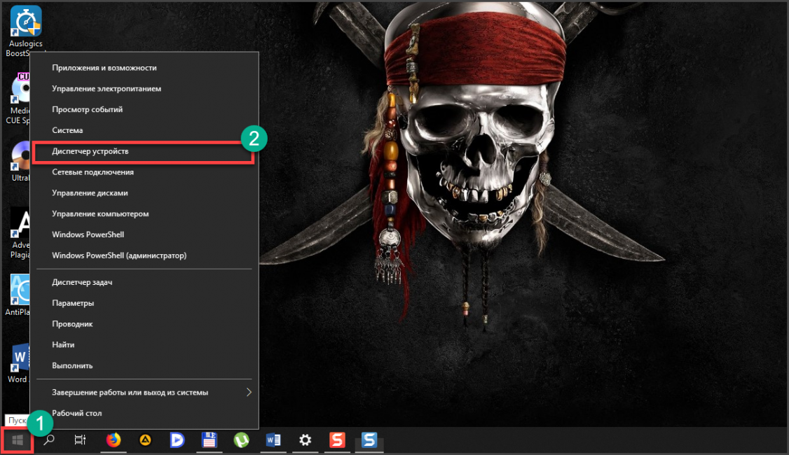 Снова кликаем по кнопке «Пуск» правой кнопкой мыши (1) и выбираем «Диспетчер устройств» (2).