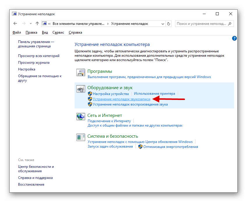 В «Оборудование и звук» откройте «Устранение неполадок звукозаписи».
