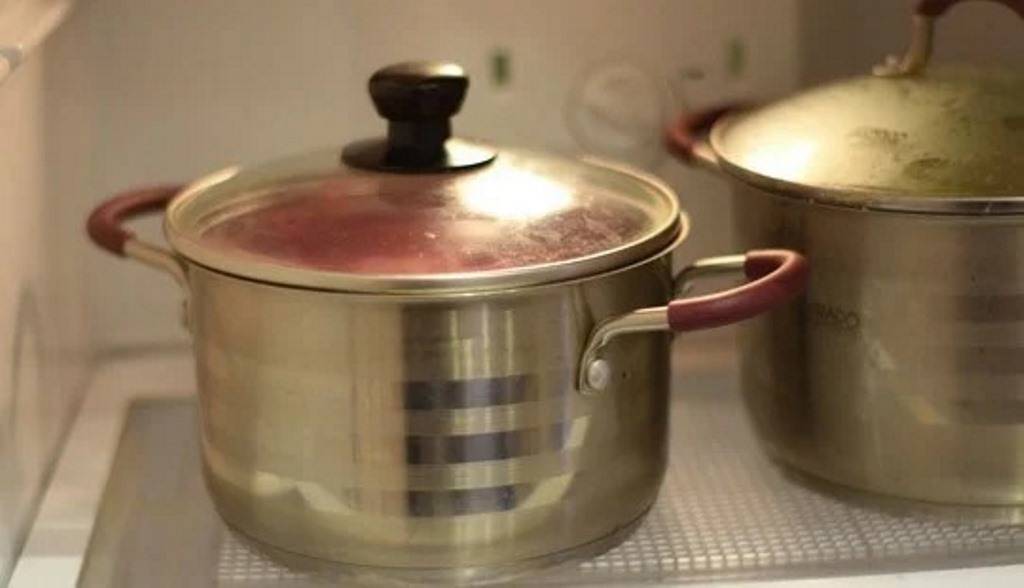 - кастрюлю можно опустить в емкость с холодной водой, только следует помнить, что стеклянная и эмалированная посуда могут покрыться микротрещинами;
