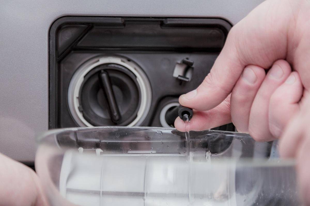 Одной из причин может быть и поломка помпы, которая находится внутри прибора. Если поломался насос, то, как слить воду. Перед работой по устранению неполадки со сливом нужно отключить прибор от электричества. Для начала нужно понять, как слить воду и освободить прибор. Для этого потребуется открыть съемную панель внизу машинки, открутить находящийся там фильтр и аккуратно немного наклонив прибор вперед вылить воду в подходящую для этого емкость.