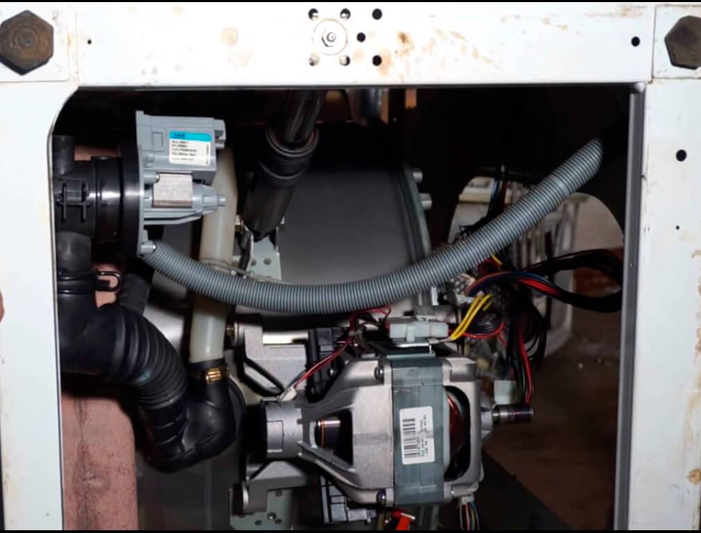 В зависимости от модели вашей стиралки, помпа может находиться впереди или сзади корпуса. Убрав нужную панель, осмотрите сливной шланг и патрубок. Прощупайте их рукой. Если внутри образовался засор, прочистите его под проточной водой.