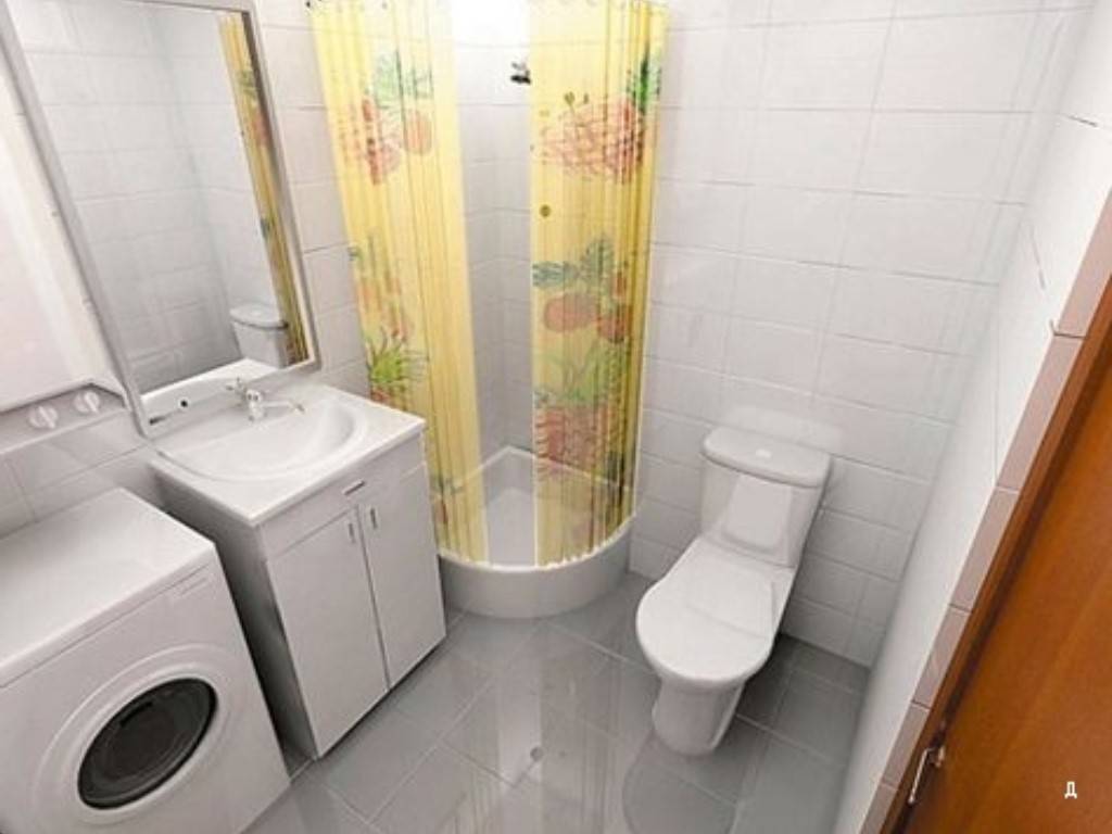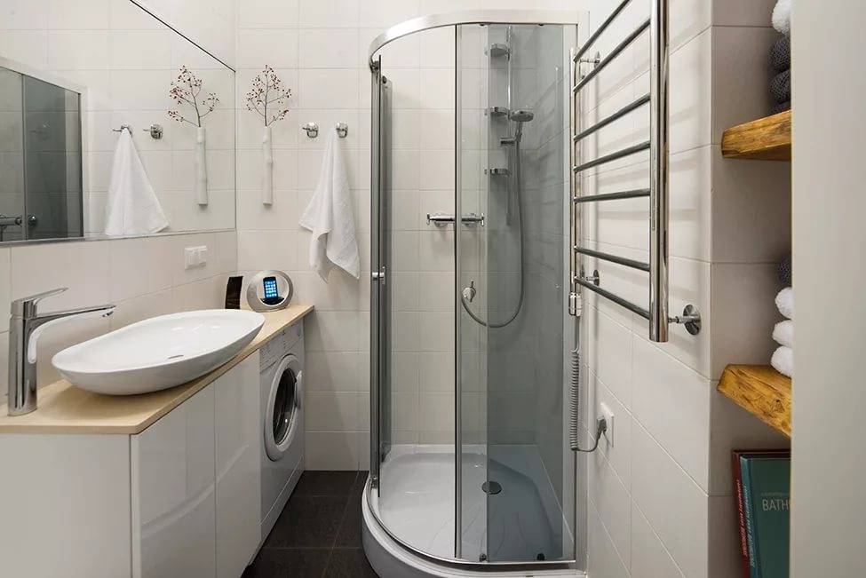Недостатком считается то, что здесь не остается места для стиральной машинки, что, однако, легко решается ее размещением под раковиной. Вариант удобен тем, что отпадает необходимость перепланировки всего санузла.