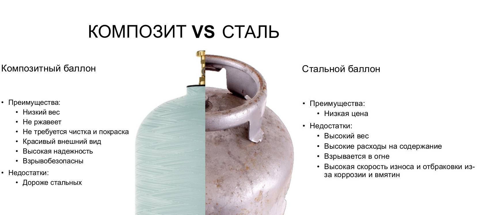 Для бытовых нужд, как правило, используются металлические (стальные) газовые сосуды или колбы из композитных материалов. Каждый из них имеет свои плюсы и минусы