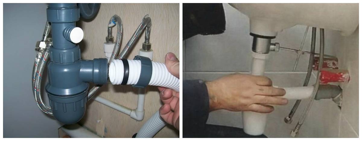 Подсоединение сифона к гофрированной трубе на кухне и к жесткой в ванной