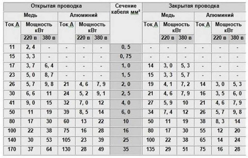 Как правило, сечение проводников выбирают по определению типа сети — 220 В или 380 В, типа прокладки проводки, а она может быть открытая или закрытая, а также от потребляемого тока или мощности оборудования. Обычно используют медные проводники с жилой 4 мм (при длине линии до 12 м) или 6 мм.