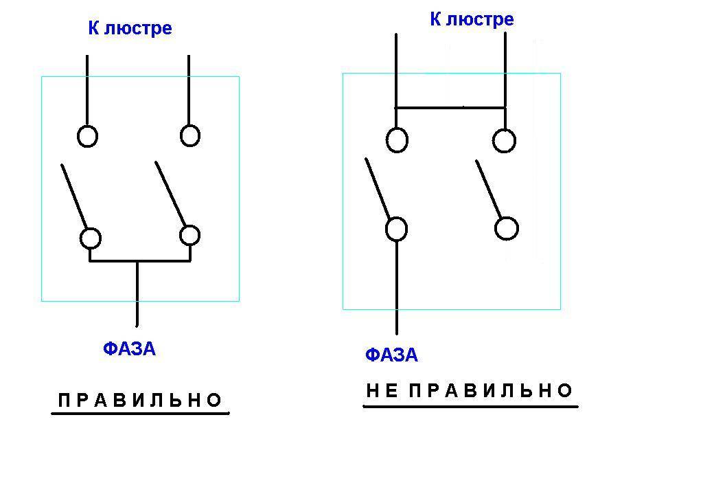 Это наиболее распространенная ошибка, заключающаяся в том, что входящий фазный провод подключают к одному из выходных контактов выключателя. При такой схеме подключения люстра не может нормально функционировать, так как одна секция ламп включается только при условии, что на другую секцию подано напряжение.