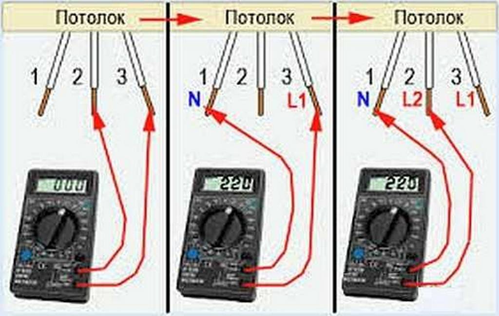 Выполнить определение проводного назначения несложно. В момент включенного выключателя лишь 1 из источников не имеет напряжения, на остальных светятся индикаторы. Если выключать поочередно клавиши света, то возможно понять, какой элемент соответствует выключателю.