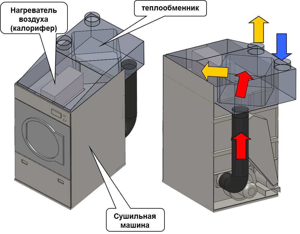 Вентиляционный. Нагретый воздух выносит «влажность» наружу машины. Это самый простой способ сушки, но он требует около машины достаточную вентиляцию и может подпортить окружающие пространство излишней влагой.